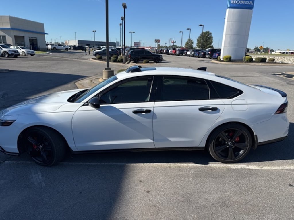 This 2024 Honda Accord Hybrid comes equipped with 4-Wheel Disc Brakes, 8 Speakers, ABS brakes, Adaptive Cruise Control: Adaptive Cruise Control (ACC) with Low-Speed Follow, Air Conditioning, Alloy wheels, AM/FM radio, Apple CarPlay/Android Auto, Auto High-beam Headlights, Automatic temperature control, Blind Spot Information (BSI) System warning, Brake assist, Bumpers: body-color, Compass, Delay-off headlights, Driver door bin, Driver vanity mirror, Dual front impact airbags, Dual front side impact airbags, Electronic Stability Control, Emergency communication system: HondaLink, Exterior Parking Camera Rear, Four wheel independent suspension, Front anti-roll bar, Front Bucket Seats, Front Center Armrest, Front dual zone A/C, Front reading lights, Fully automatic headlights, Heated Front Bucket Seats, Heated front seats, Illuminated entry, Knee airbag, Lane departure: Lane Keeping Assist System (LKAS) active, Leather Shift Knob, Leather steering wheel, Leather-Trimmed Seat Trim, Low tire pressure warning, Memory seat, Occupant sensing airbag, Outside temperature display, Overhead airbag, Overhead console, Panic alarm, Passenger door bin, Passenger vanity mirror, Power door mirrors, Power driver seat, Power moonroof, Power passenger seat, Power steering, Power windows, Radio data system, Radio: 180-Watt Audio System, Rear anti-roll bar, Rear reading lights, Rear seat center armrest, Rear side impact airbag, Rear window defroster, Remote keyless entry, Security system, Speed control, Speed-sensing steering, Speed-Sensitive Wipers, Split folding rear seat, Spoiler, Steering wheel mounted audio controls, Telescoping steering wheel, Tilt steering wheel, Traction control, Trip computer, Variably intermittent wipers, and Wheels: 19" x 8.5J Matte Berlina Black.