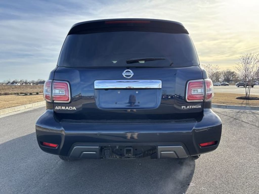 This 2019 Nissan Armada comes equipped with 13 Speakers, 2.937 Axle Ratio, 2nd & 3rd Row Carpeted Mats, 3rd row seats: split-bench, 4-Wheel Disc Brakes, A/V remote, ABS brakes, Air Conditioning, Alloy wheels, AM/FM radio: SiriusXM, Anti-whiplash front head restraints, Auto tilt-away steering wheel, Auto-dimming door mirrors, Auto-dimming Rear-View mirror, Auto-leveling suspension, Automatic temperature control, Brake assist, Bumpers: body-color, CD player, Cross Bars, Delay-off headlights, Driver door bin, Driver vanity mirror, Dual front impact airbags, Dual front side impact airbags, Electronic Stability Control, Emergency communication system: NissanConnect Services, Four wheel independent suspension, Front anti-roll bar, Front Bucket Seats, Front Center Armrest, Front dual zone A/C, Front fog lights, Front reading lights, Fully automatic headlights, Garage door transmitter: HomeLink, Headphones, Heated & Cooled Front Bucket Seats w/Driver Memory, Heated door mirrors, Heated front seats, Heated rear seats, Heated steering wheel, Illuminated entry, Illuminated Kick Plates, Leather Shift Knob, Leather-Appointed Seat Trim, Low tire pressure warning, Memory seat, Navigation System, Occupant sensing airbag, Outside temperature display, Overhead airbag, Overhead console, Panic alarm, Passenger door bin, Passenger vanity mirror, Power door mirrors, Power driver seat, Power Liftgate, Power moonroof, Power passenger seat, Power steering, Power windows, Radio data system, Radio: AM/FM/SXM/CD/MP3/HD, Rain sensing wipers, Rear air conditioning, Rear anti-roll bar, Rear reading lights, Rear seat center armrest, Rear window defroster, Rear window wiper, Reclining 3rd row seat, Remote keyless entry, Roof rack: rails only, Security system, Speed control, Speed-sensing steering, Speed-Sensitive Wipers, Split folding rear seat, Spoiler, Steering wheel memory, Steering wheel mounted audio controls, Tachometer, Telescoping steering wheel, Tilt steering wheel, Traction control, Trip computer, Turn signal indicator mirrors, Variably intermittent wipers, Ventilated front seats, Voltmeter, and Wheels: 20" Machine-Faced Chrome w/Tinted CC.